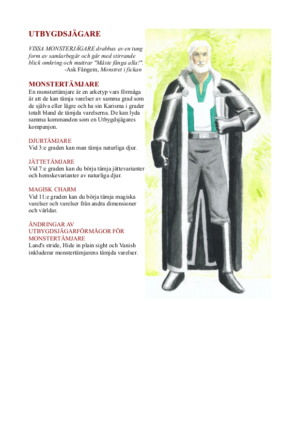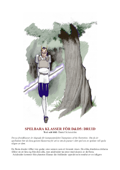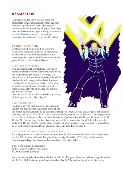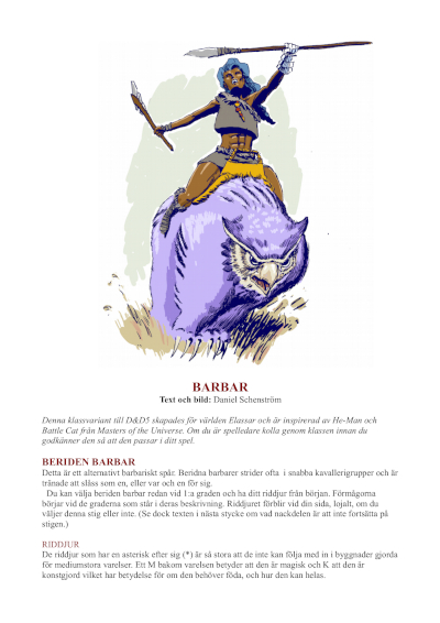 KLASSER Alla klasser här är designade för D&D 5 och ingår också i Yuletomte's Guide. BARBAR (PDF, svenska) ODT-fil (svenska) BARBARIAN (PDF, engelska) Beriden barbar är ett nytt barbarspår. CLERICS (PDF) ODT-fil Två nya prästvarianter, andepräst som kan frammana andar och ta över djurandar, och alviska demonpräster som får kraft mot en livsviktig lojalitet. DRUIDS (PDF) ODT-fil Djurvännen är en variant lik den klassiska druiden från tidigare utgåvor och askdruiden har ett speciellt band till vandöda. RANGERS (PDF) ODT-fil Djurtämjaren och draktämjaren är två nya alternativ för utbygdsjägaren. Den första kan ha en skock med djur med sig medan den andra vårdar sitt band till en drake från ägg till ungdom. WARLOCKS (PDF) ODT-fil Evigheternas bok öppnar ögonen till ett enormt universums kunskap men kan också ha nackdelar för det mentala tillståndet. |