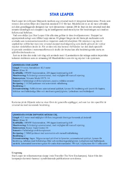 RYMDSKEPP Denna sektion innehåller rymdskepp med beskrivningar och kartor. Kartorna kan även hittas separat. RYMDSKEPP PDF RYMDSKEPP ODT 5 sidor, illustrerad, med kartor Science Fiction Ingår i: Rymden Uppdaterad: 2022-02-28 Planerade uppdateringar: Uppdaterade kartor, fler skepp. |